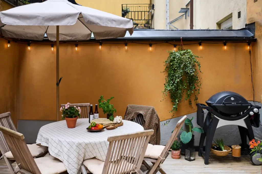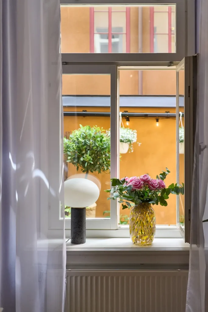 Cet appartement a de quoi surprendre par la grandeur de sa terrasse. Pourtant situé en plein centre ville de Stockholm, ce logement dispose de cet immense espace exterieurs, que es propriétaires ont su rendre hyper cosy. D’entrée de jeu, elle annonce la suite de la visite de par ce jaune ocre éclatant qui tapisse les murs. On sens que l’on va entrer dans un intérieur bien décoré et qui ne craint pas la couleur !