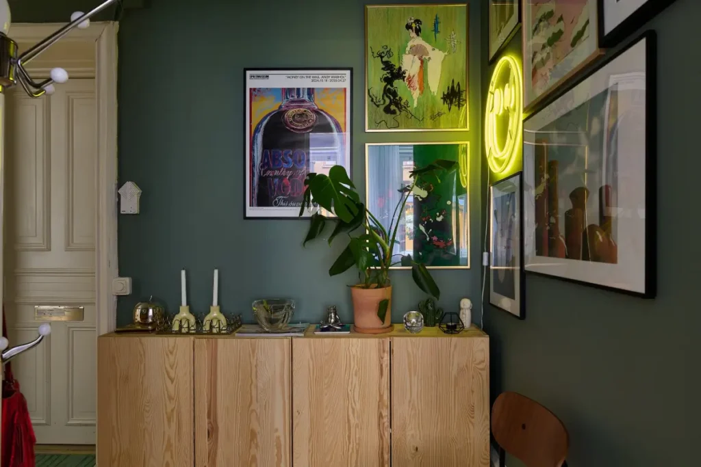 La pièce coup de cœur de cet appartement, celle qui m’a vraiment donné envie de vous en parler, c’est celle-ci ! J’adore ce couloir, je suis complètement fan de ce néon qui me rappelle le logo du groupe Nirvana ! Les couleurs sont parfaitement choisies, le miroir est magnifique et ce mur de cadre éclectique me fascine. En prime, on a un très beau parquet massif au sol, laissé brut, qui s’accorde à merveille avec les essences de bois des meubles.