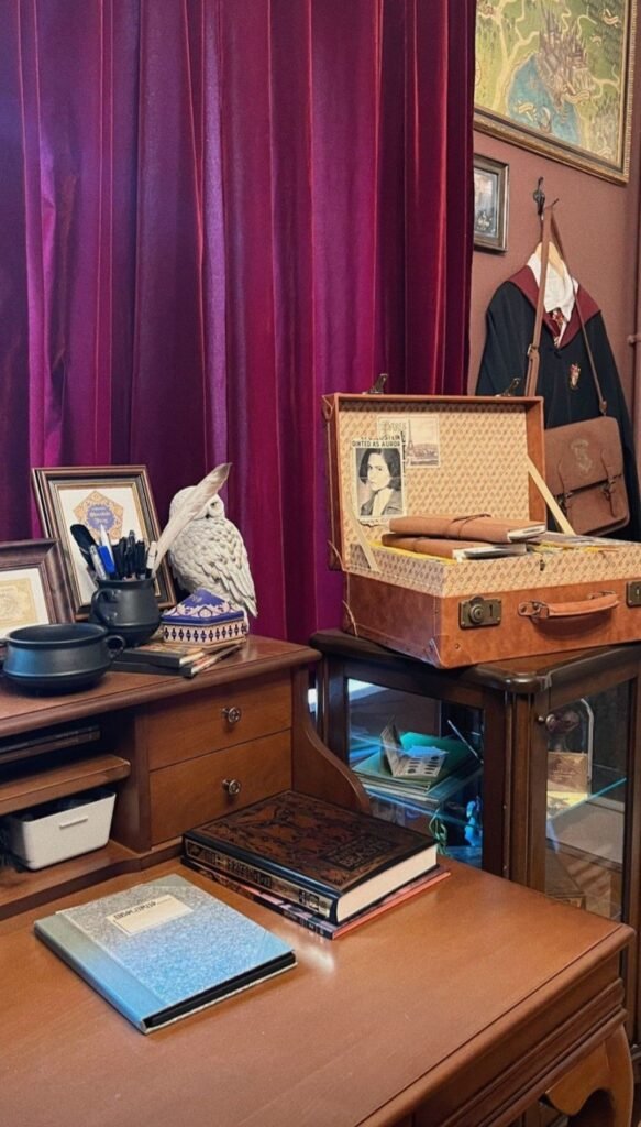 Ce sont les petits détails qui font toute la différence : une figurine Dobby posée sur une étagère, des baguettes exposées dans un présentoir, ou encore une carte du Maraudeur en poster encadré.