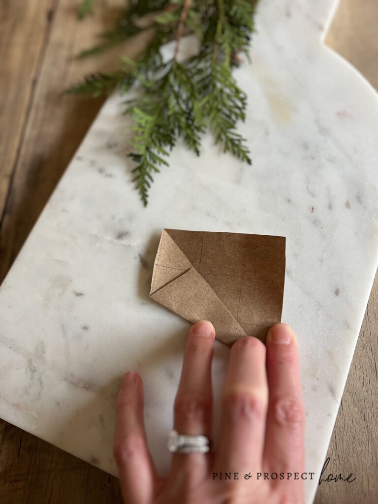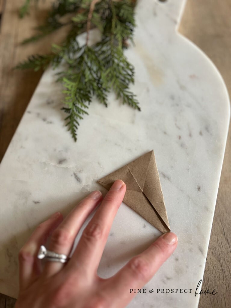 Pliez votre carré en deux comme sur la deuxième photo ci-dessous, puis dépliez-le : ce pli central vous servira de repère. Placez ensuite le carré en diagonale sur la table et rabattez les deux coins latéraux vers le coin inférieur pour obtenir une forme de cerf-volant.