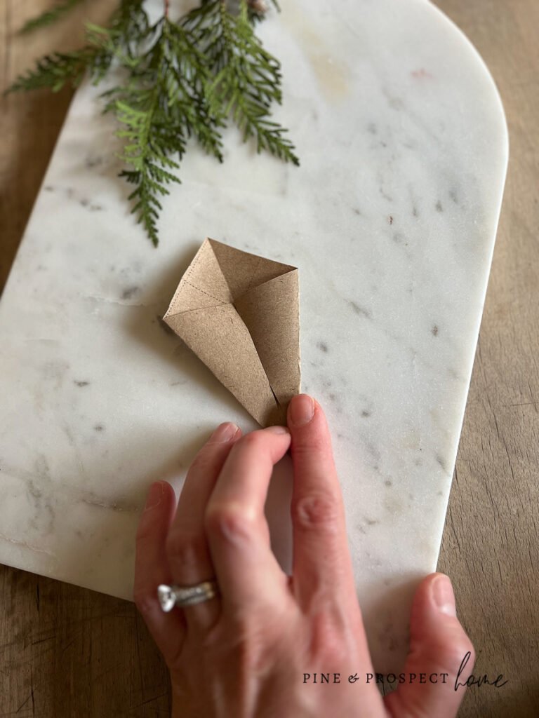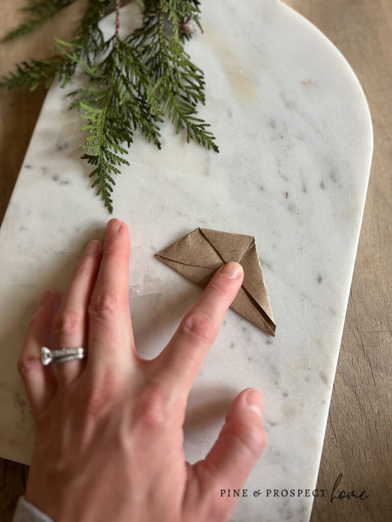 Rabattez maintenant la pointe supérieure vers le bas : vous obtenez un triangle. Pliez ensuite les deux coins du côté droit de ce triangle vers le pli central, comme illustré ci-dessous.